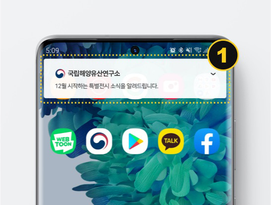 1. 국립해양유산연구소에서 보내는 이벤트, 공지사항, 특별전시, 행사안내 등의 소식을 알림 PUSH로 받으실 수 있습니다.